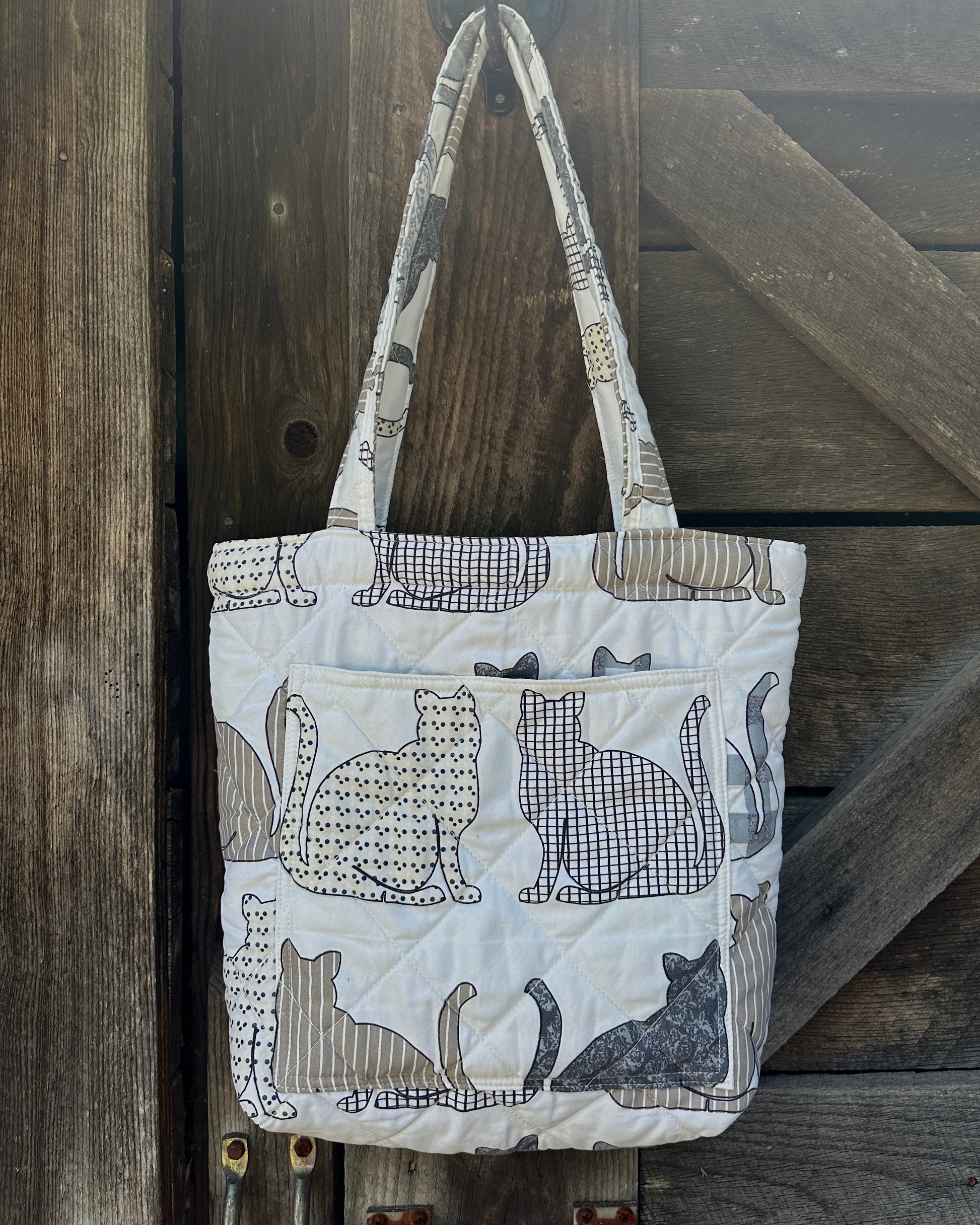 Cat tote bag made from two quilted pillow shams. Features a pocket on the outside as well as a pocket on the inside!