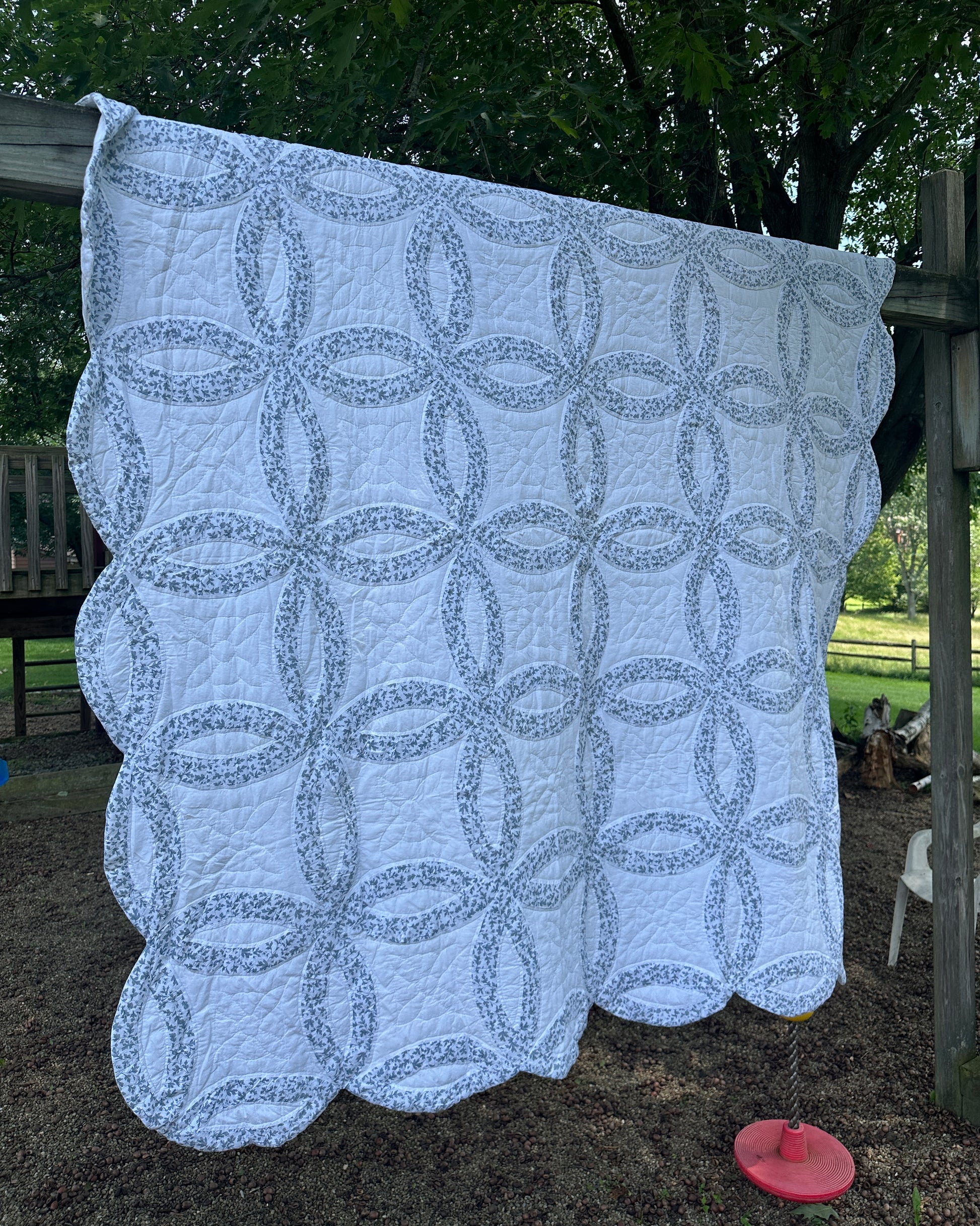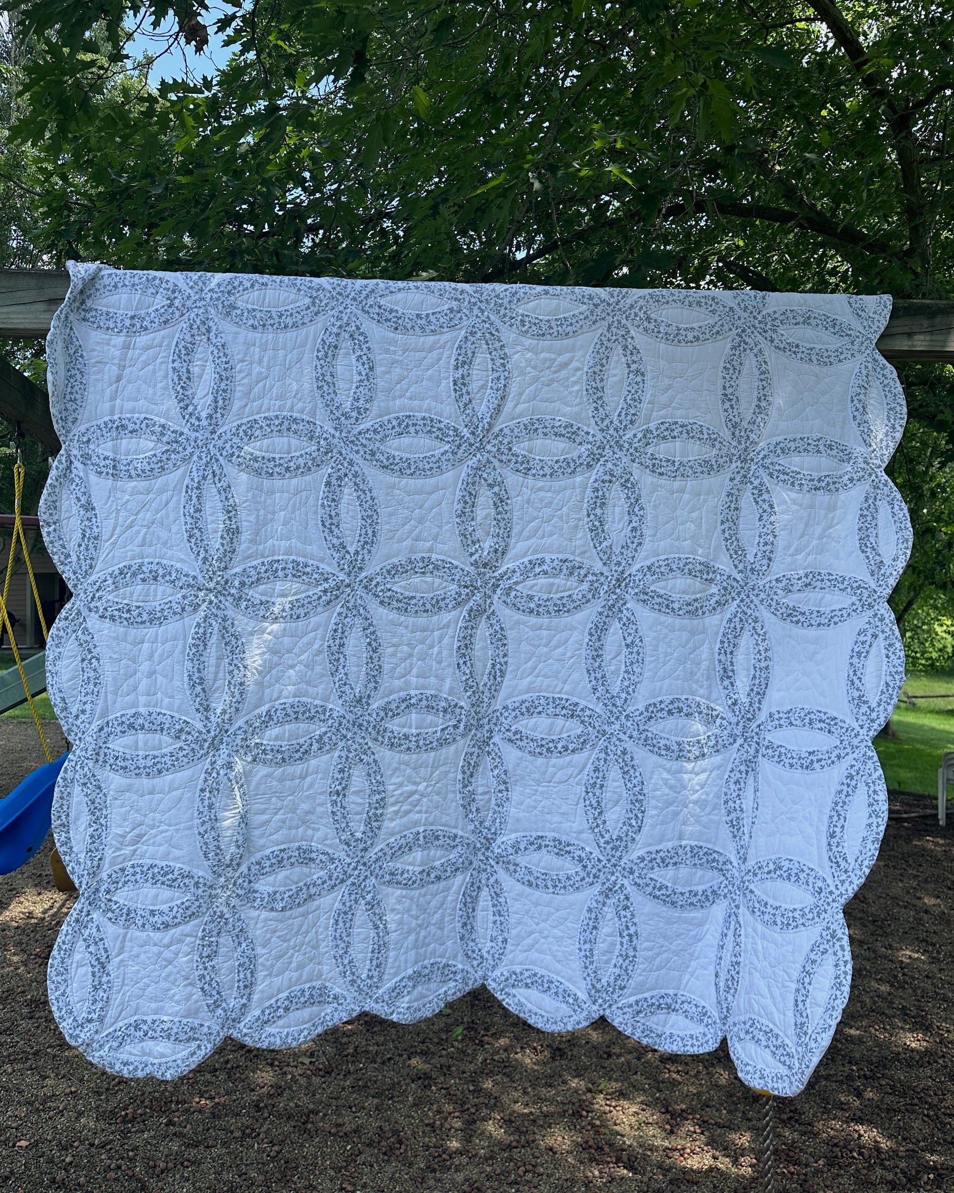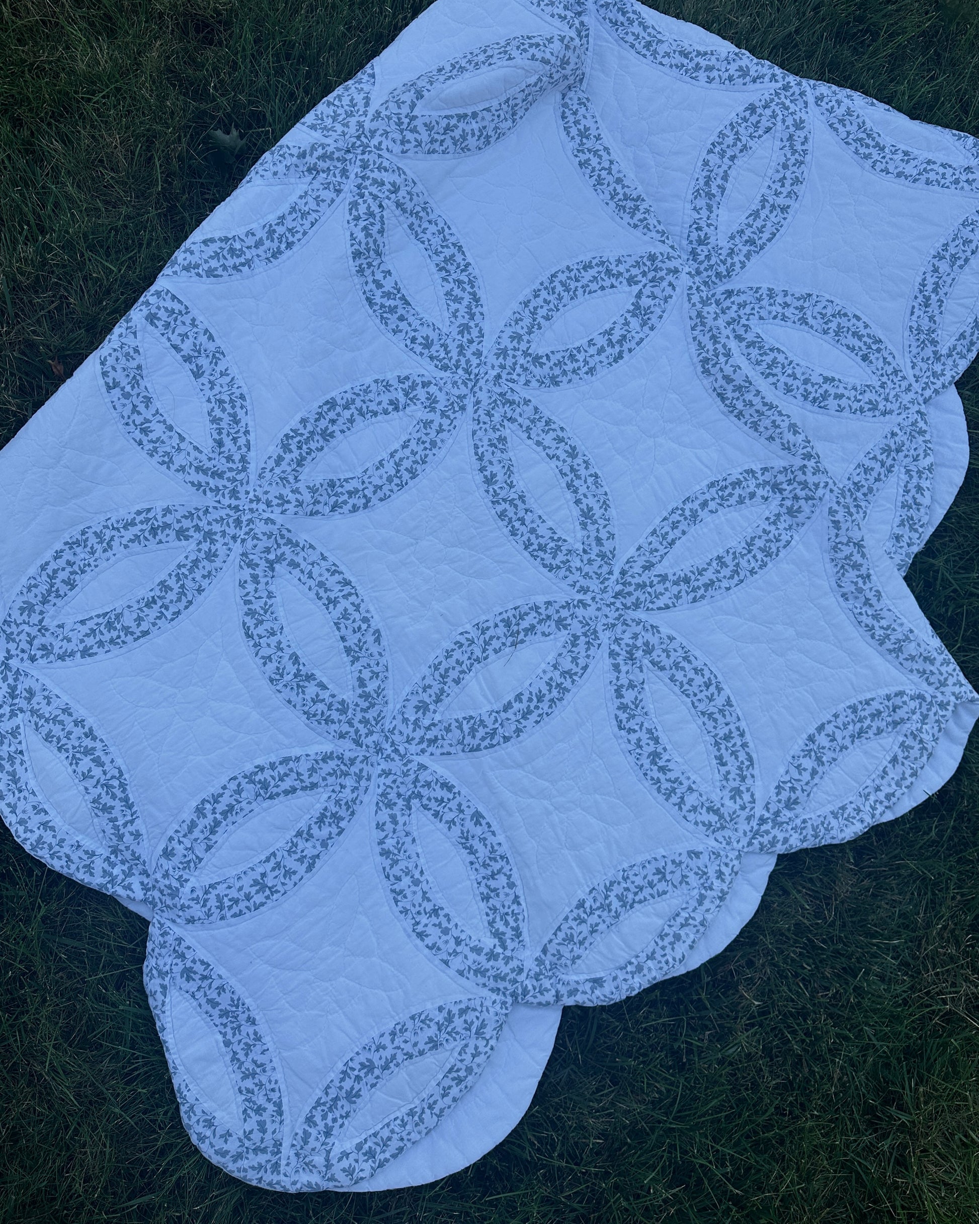 This quilt is a stunning white and blue floral, double wedding ring pattern (a classic cherished pattern symbolizing love and the joining of two lives). The edges are finished with a scalloped binding, adding a touch of elegance! This quilt is medium weight, perfect for either a jacket or hoodie.