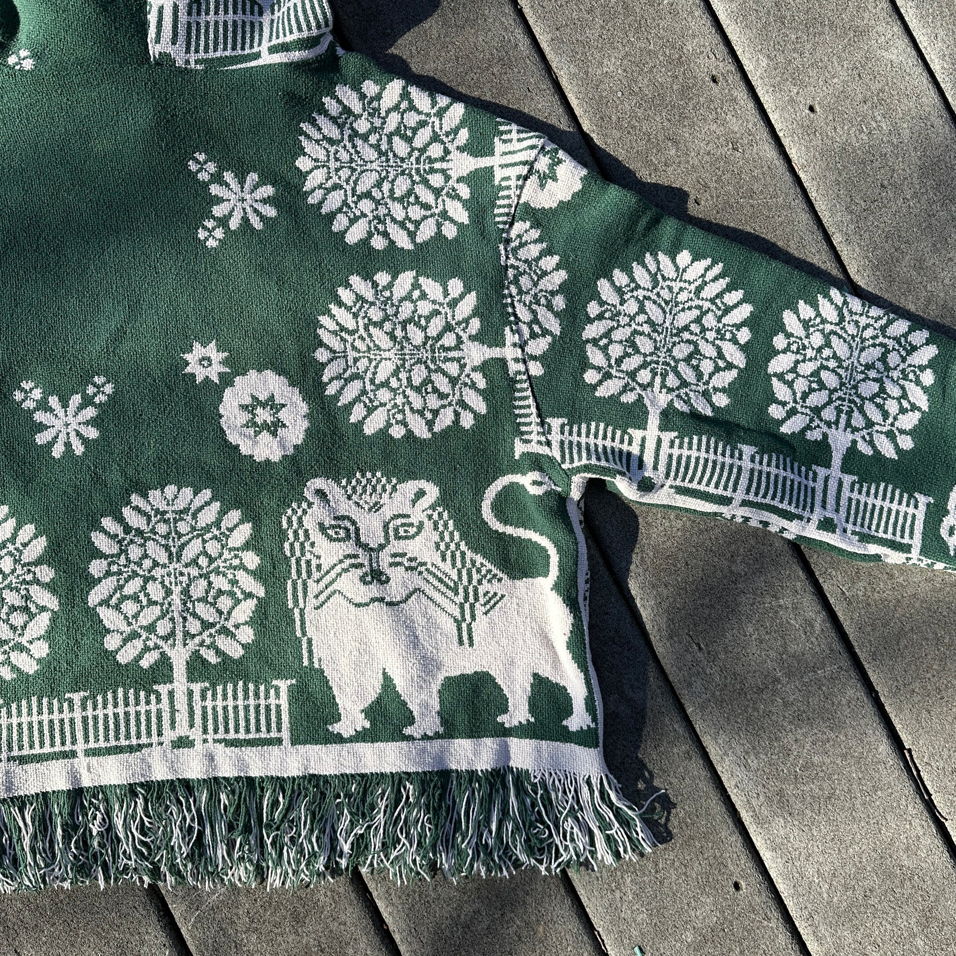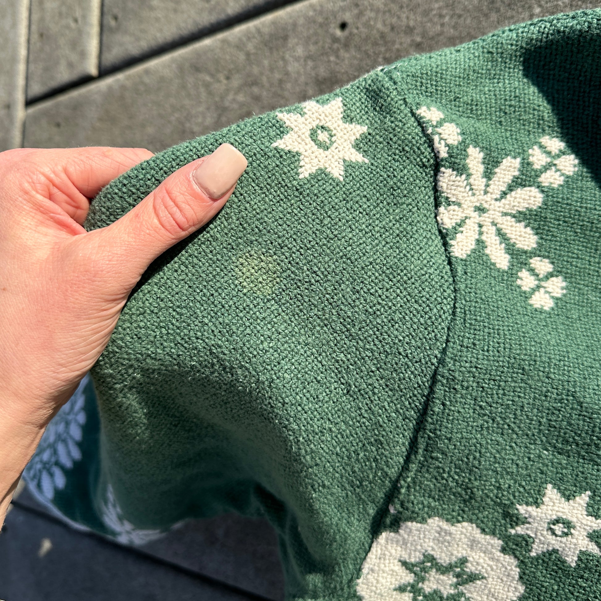 Has a small stain on sleeve - see last picture! This hoodie is way too unique not to include just because of a small stain (that you probably wouldn’t even notice if I hadn’t pointed it out.) Please do not purchase if this bothers you!