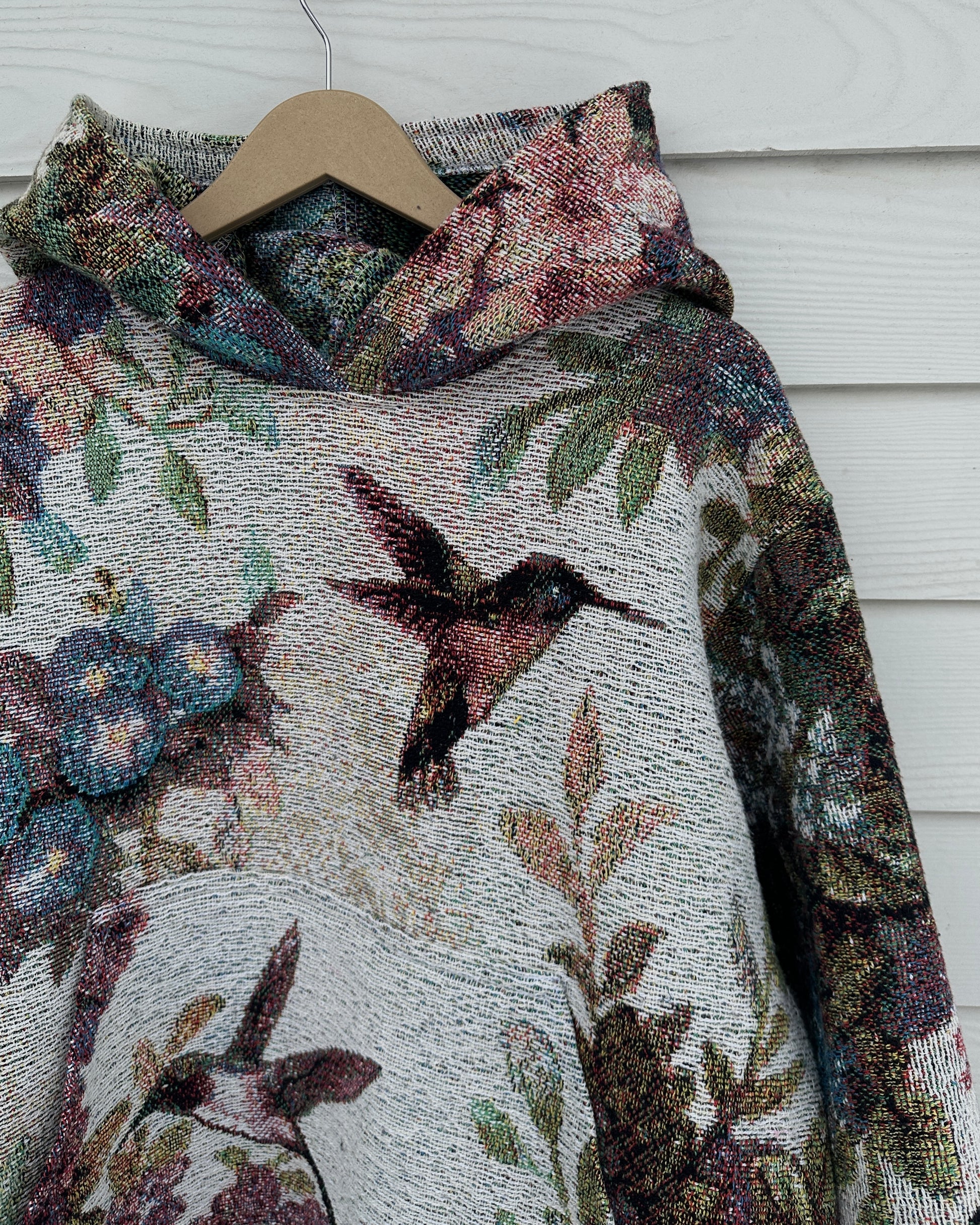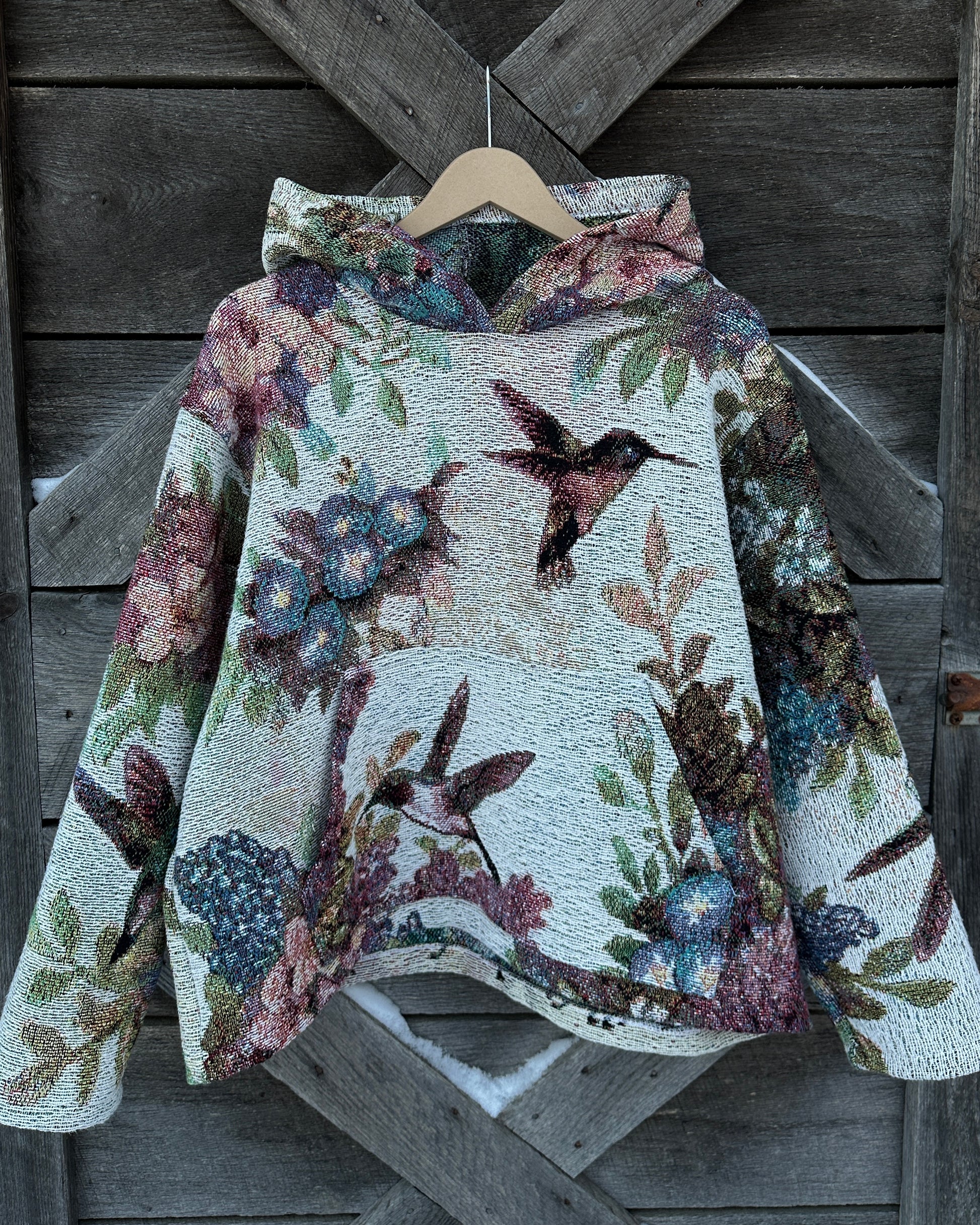 Beautiful hummingbird hoodie, made from a second hand woven blanket
