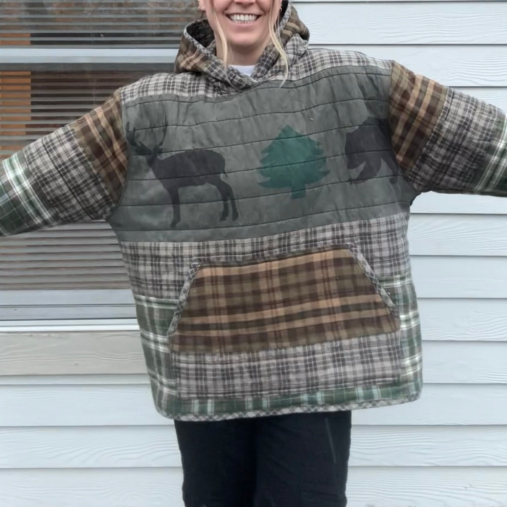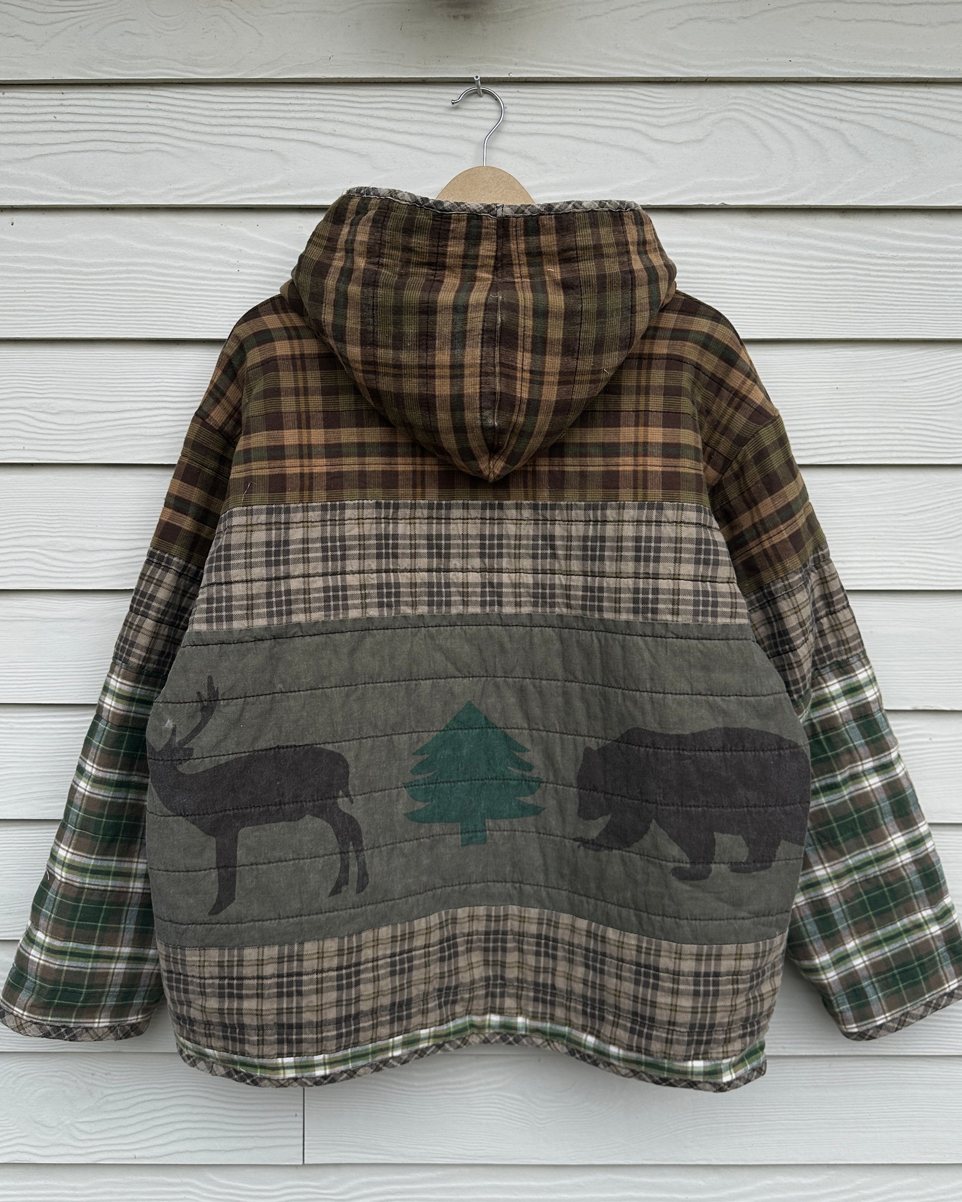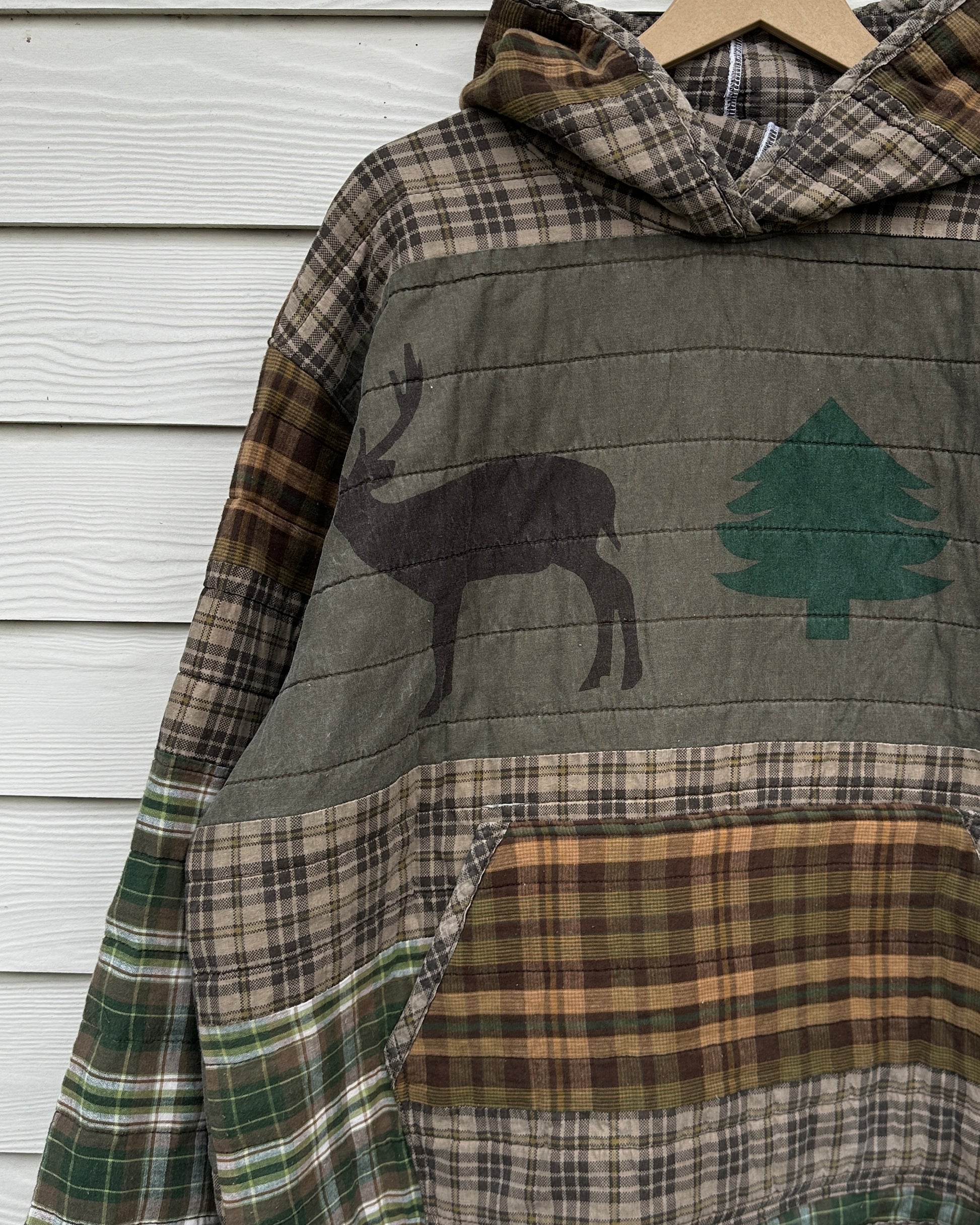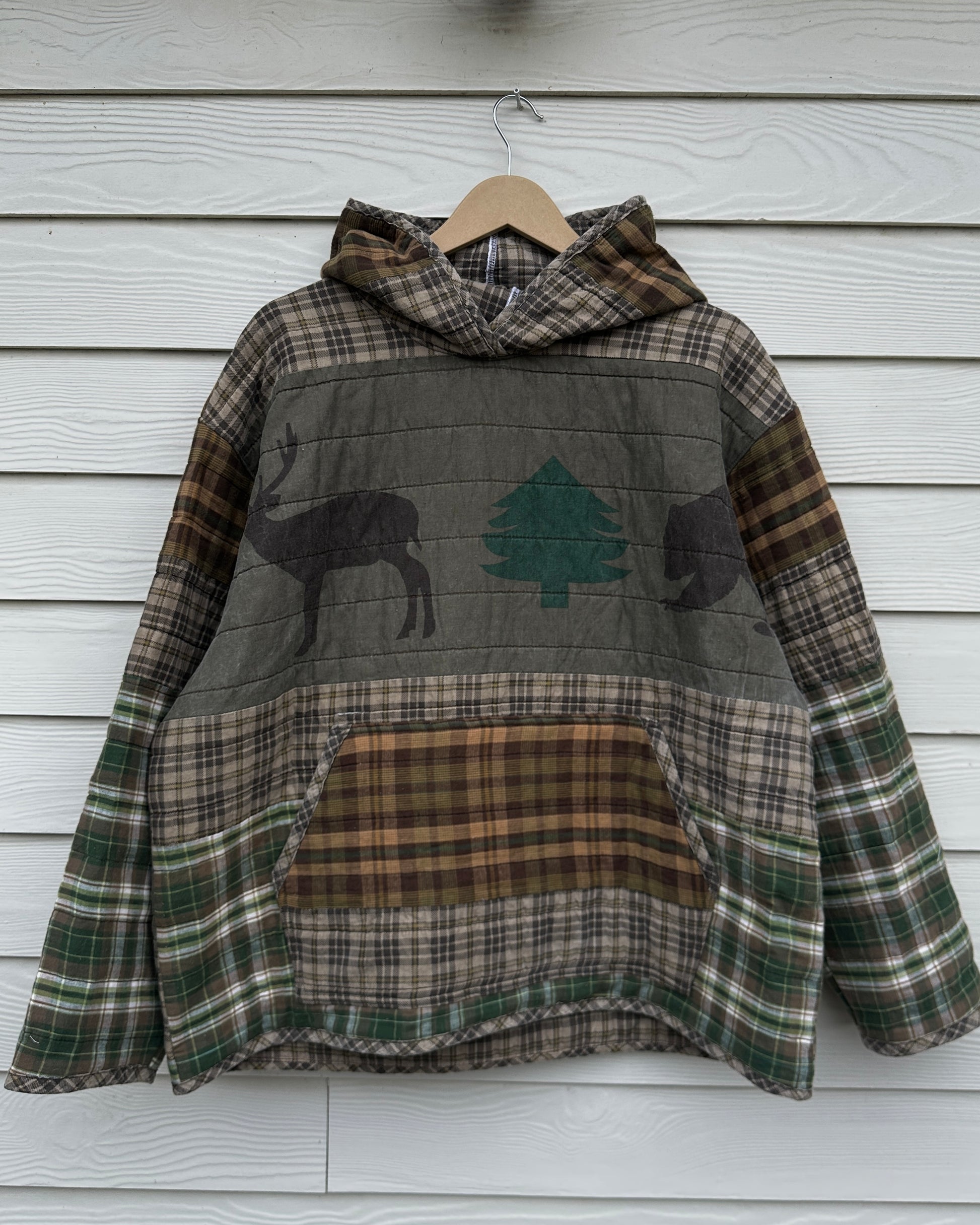 Size large hoodie, made from a secondhand quilt. Medium weight Flannel patterned quilt; featuring a buck and a bear.