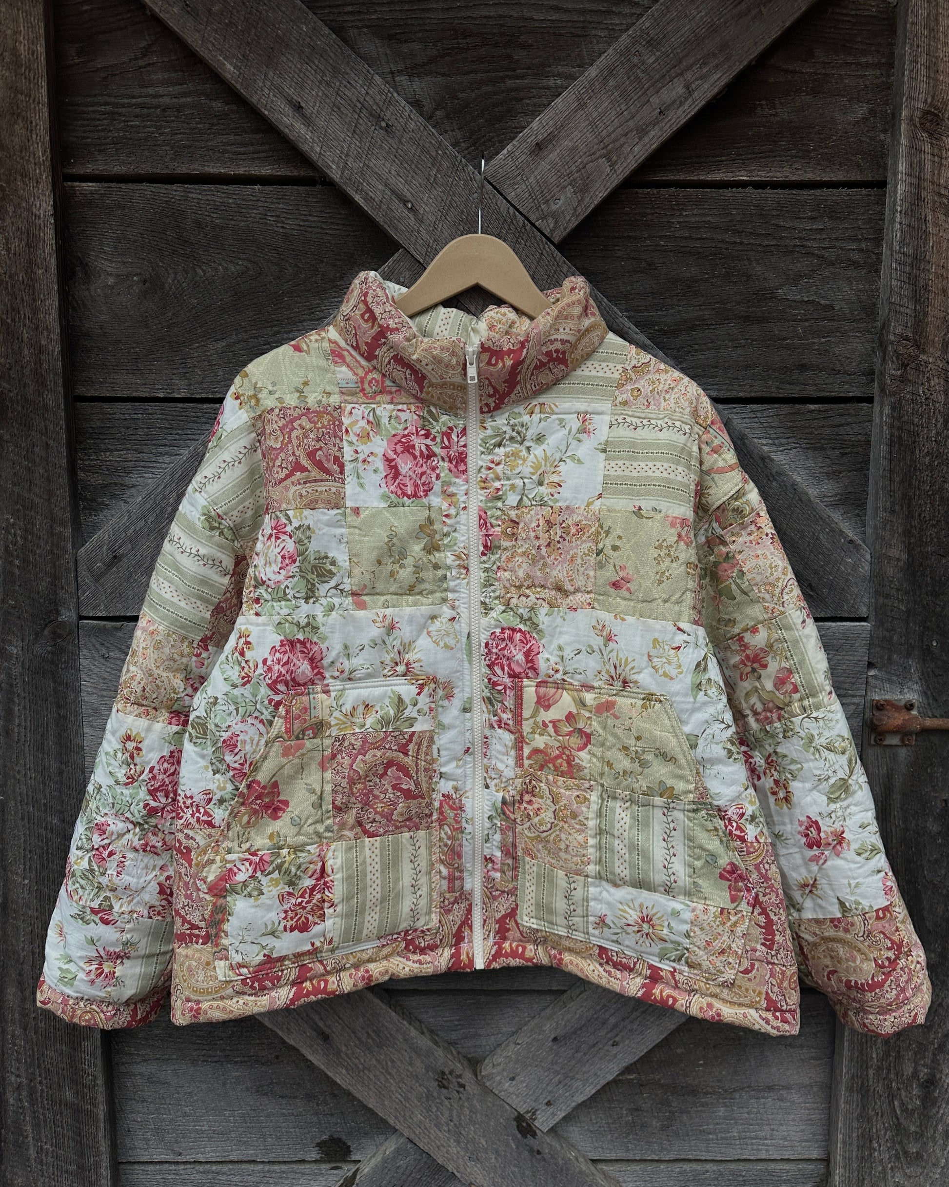 Size large jacket, made from a secondhand quilt. Jacket features a YKK zipper, large pockets, and a collar. Quilt is surprisingly light in weight but has a puffy jacket feel to it.