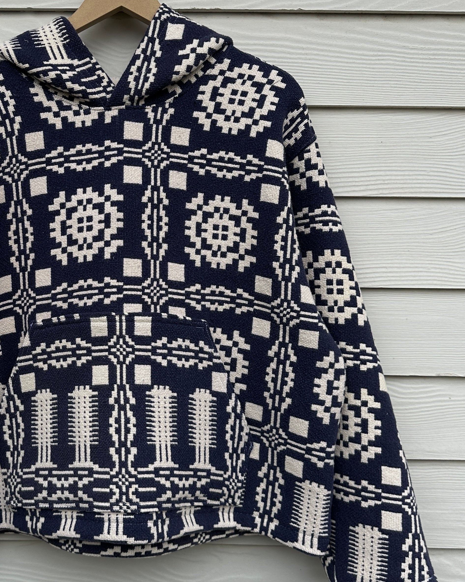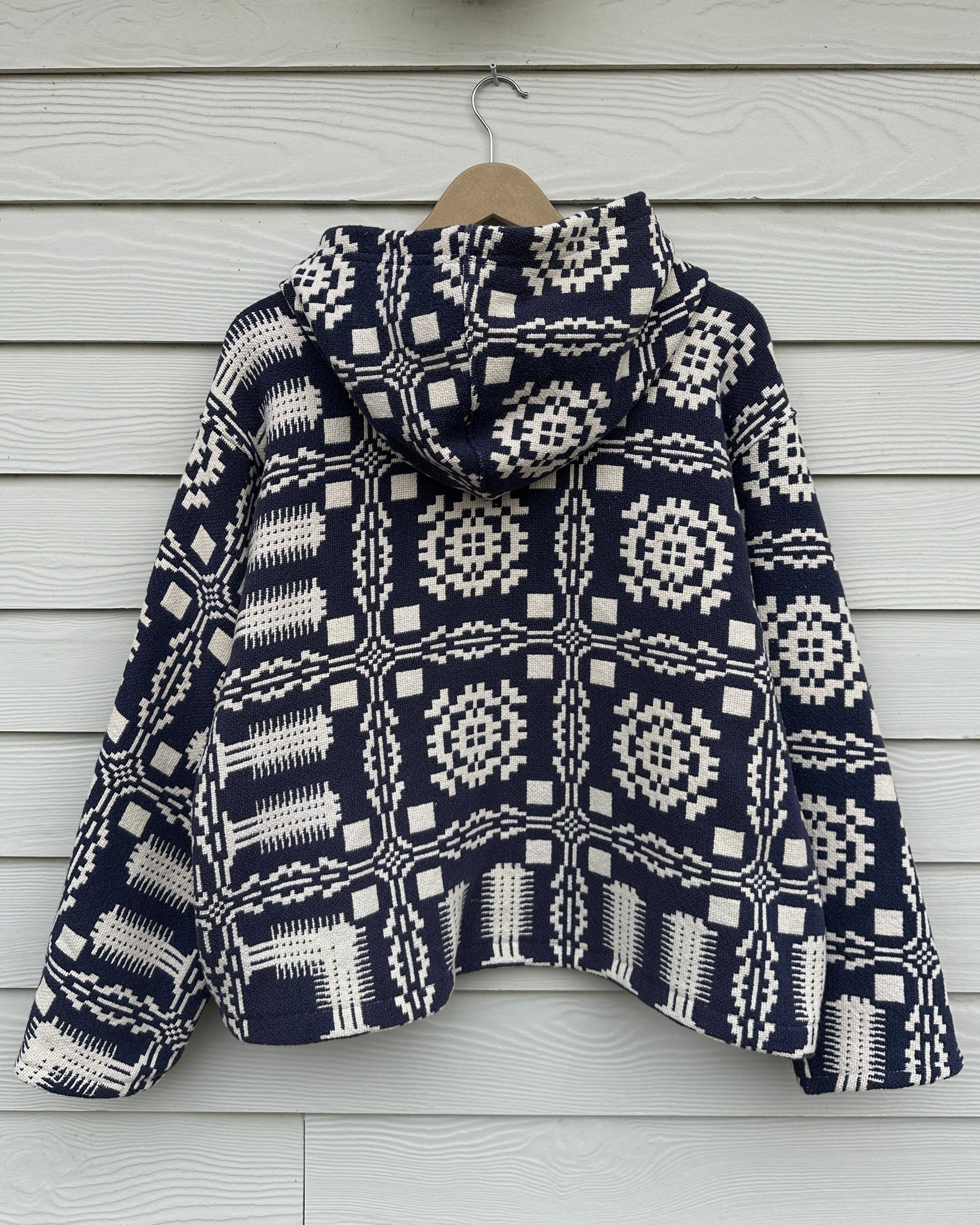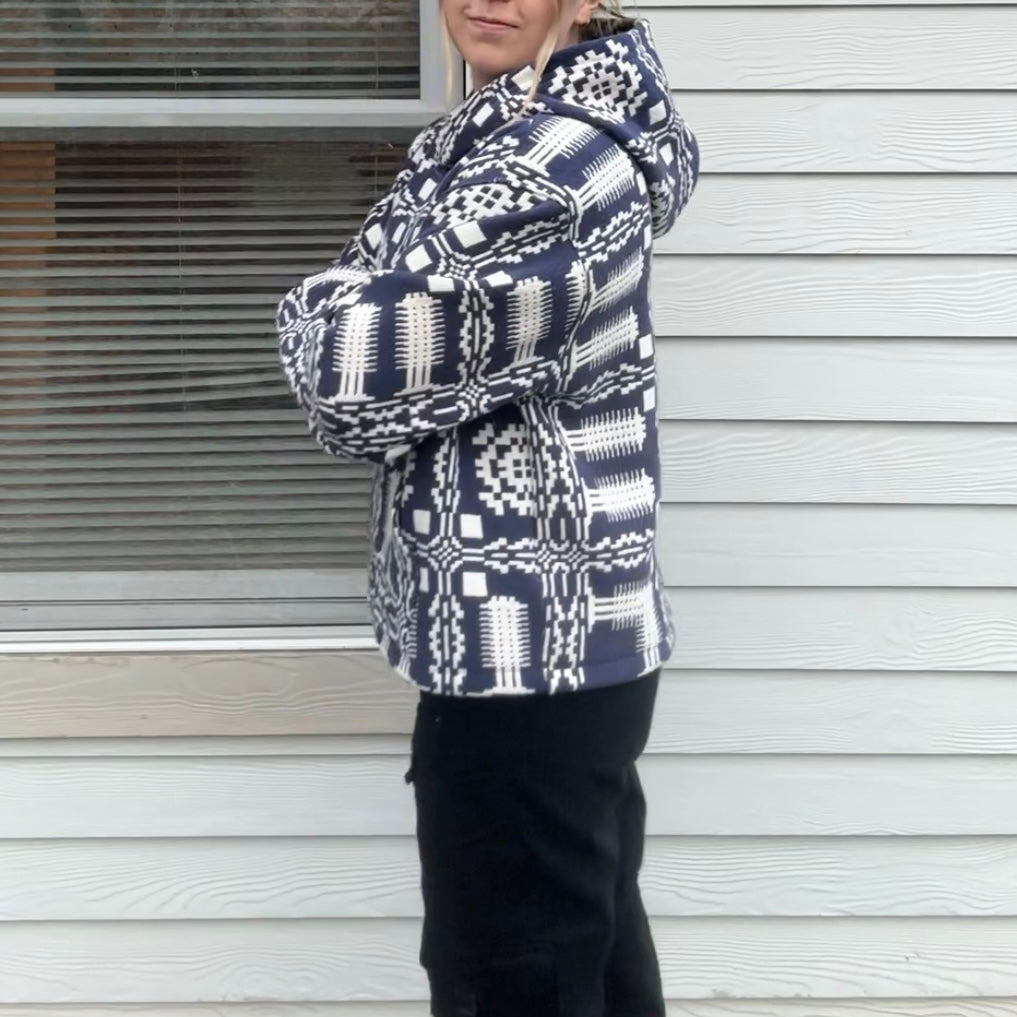 Size medium hoodie, made from a secondhand woven blanket. Fun geometric navy and white pattern, blanket is soft and in good condition.