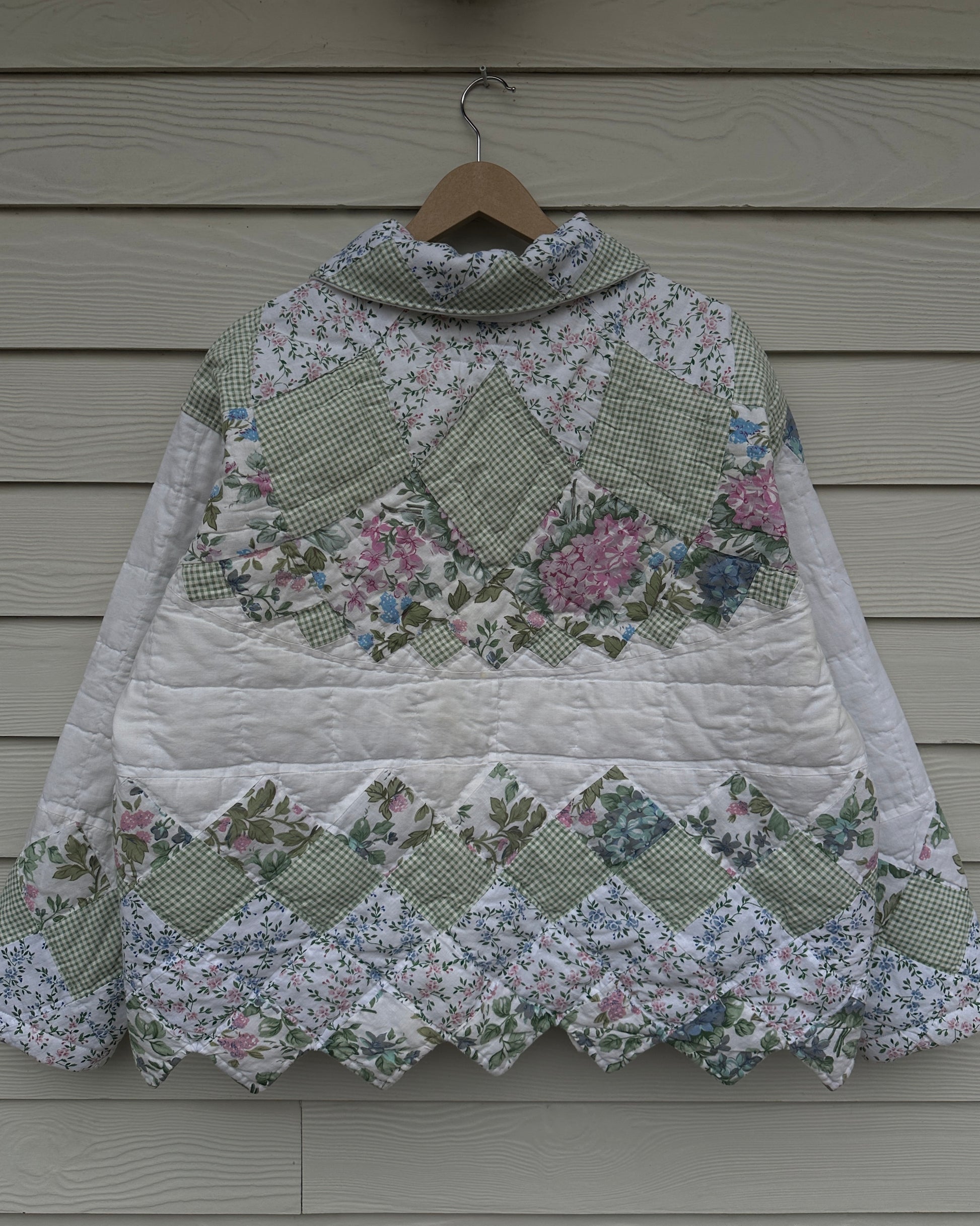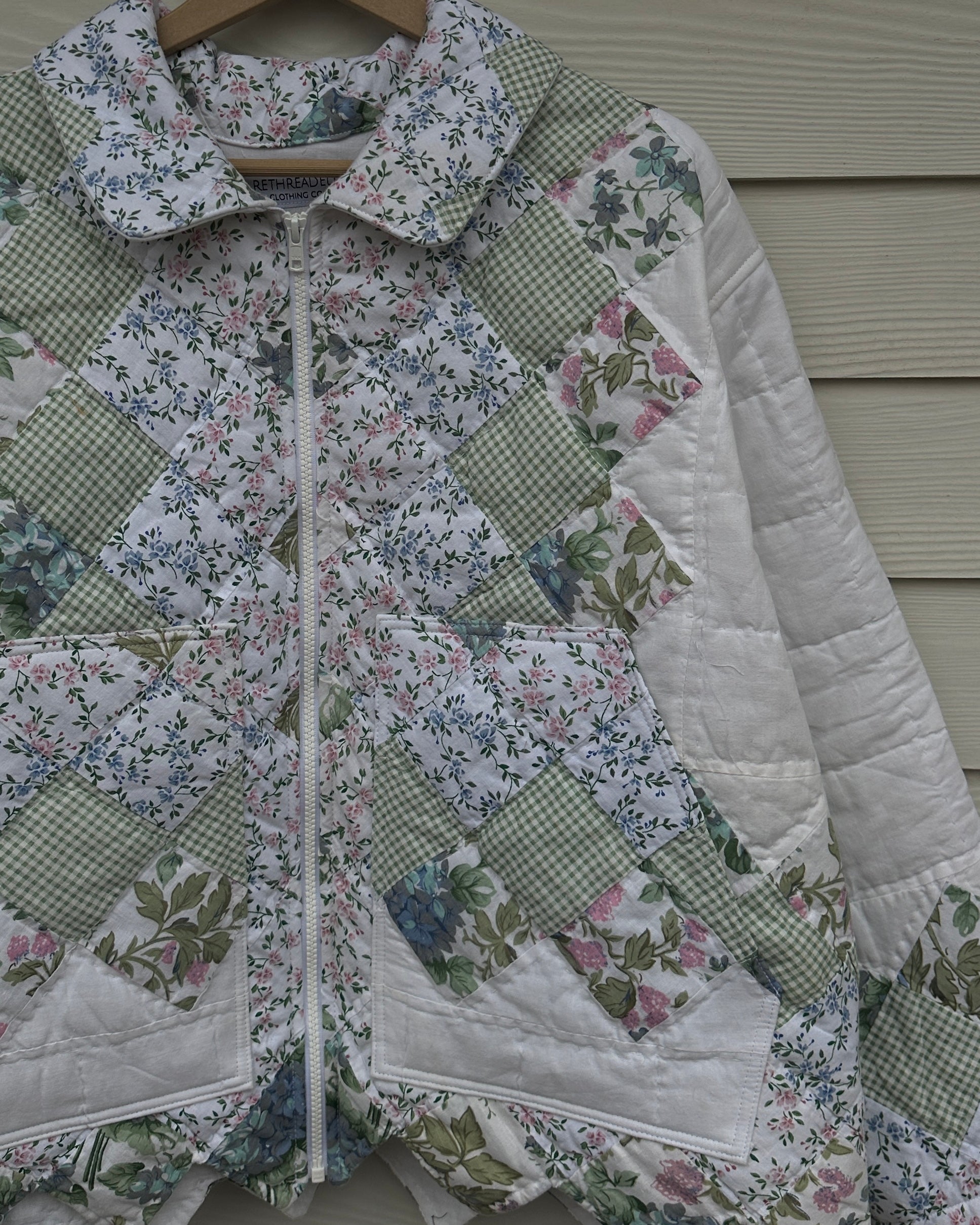 Jacket made from a stunning white quilt. Features: A fold over collar, YKK zipper, and pointed scalloped edge.