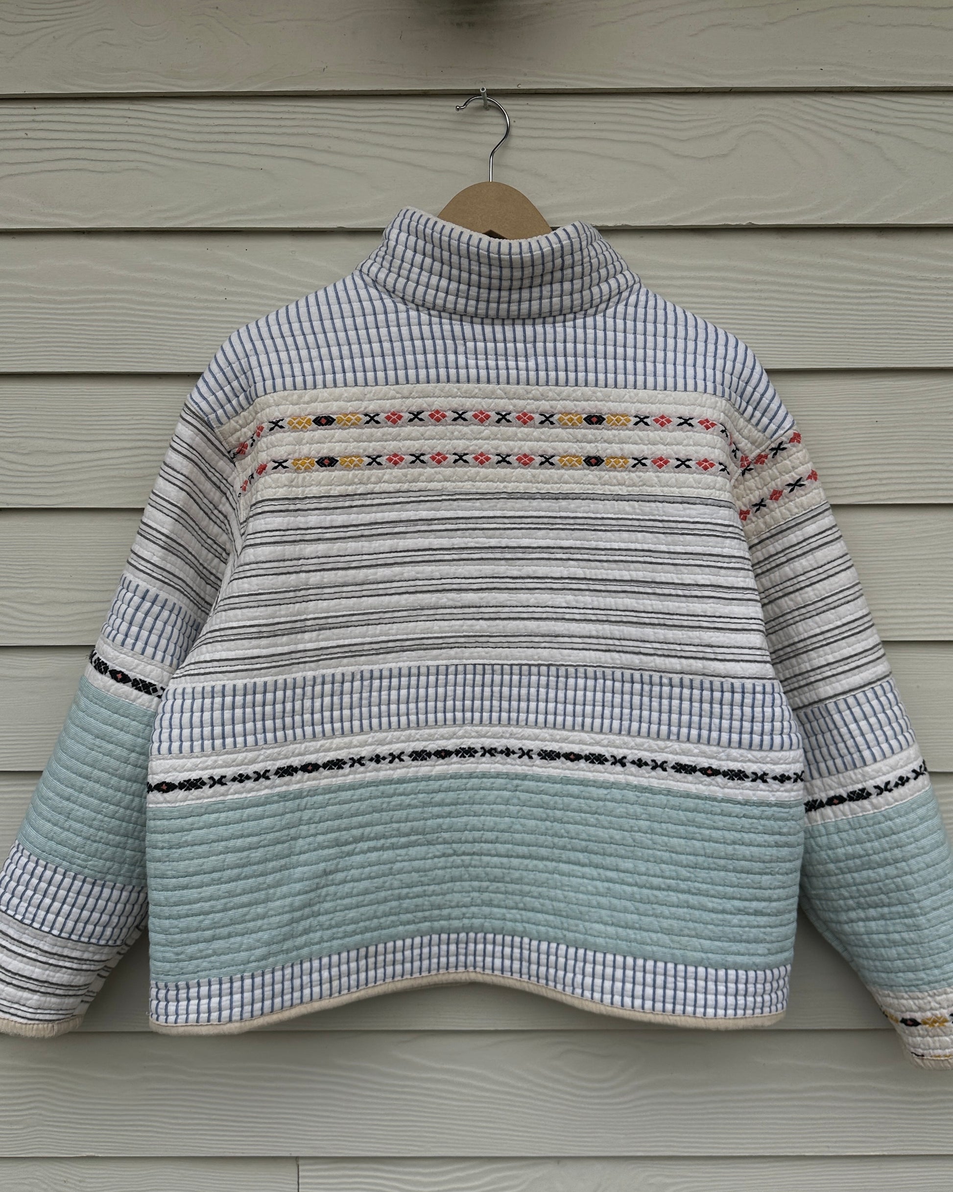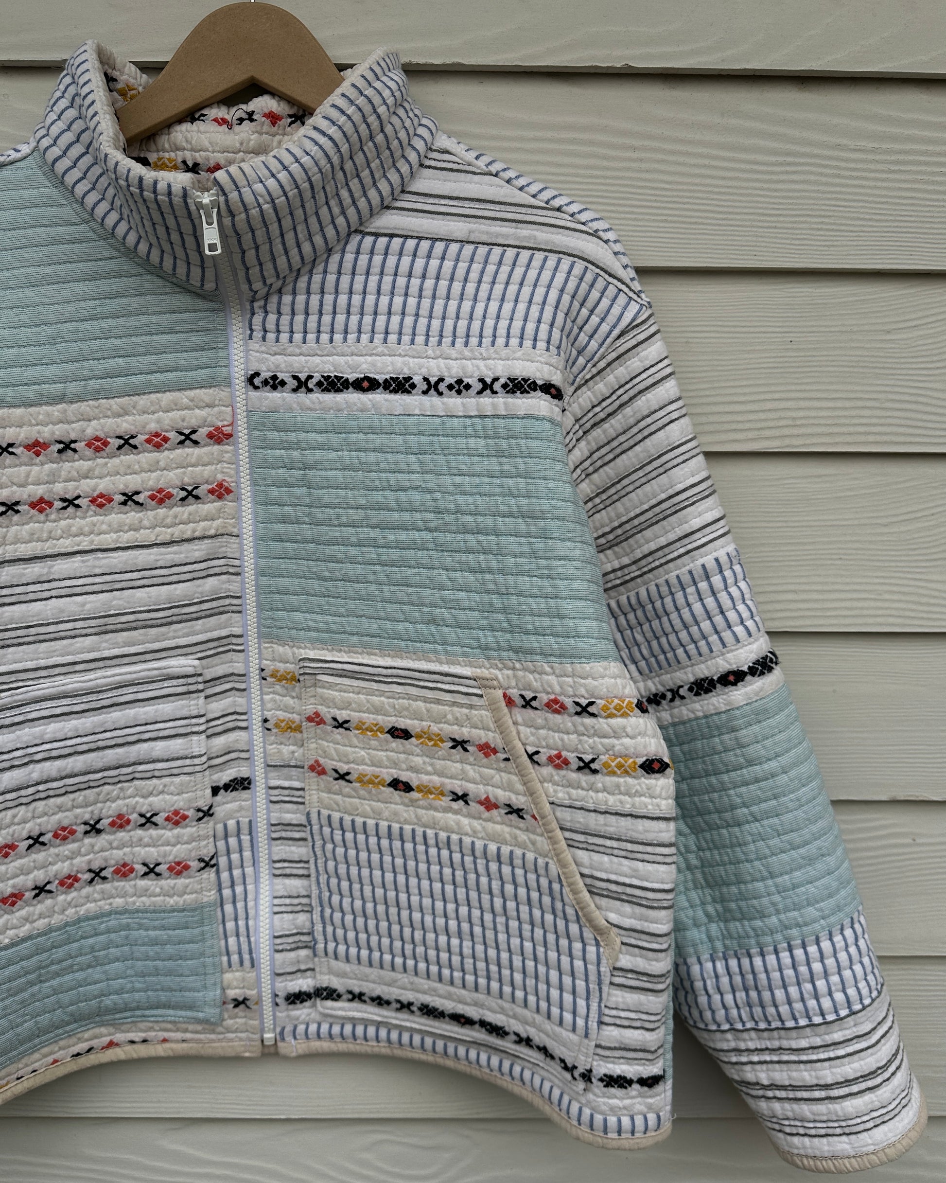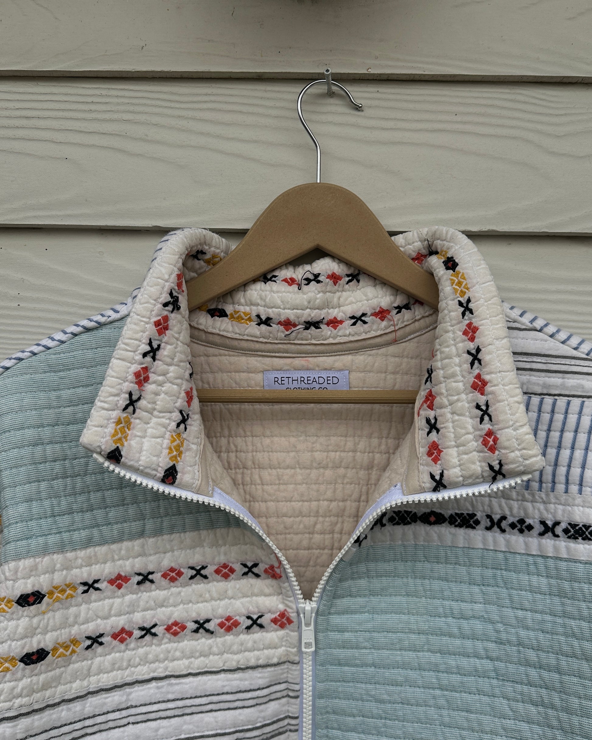 Made from a secondhand quilt. Jacket features a YKK zipper, large pockets, and a collar. Quilt is medium weight