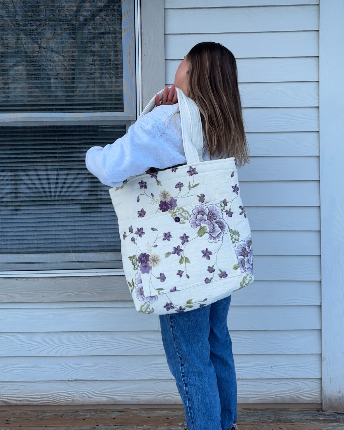 Cute floral embroidered tote bag with a large zippered pouch. Quilted outside and lined on the inside. Features a buttoned pocket on the outside and a pocket on the inside.