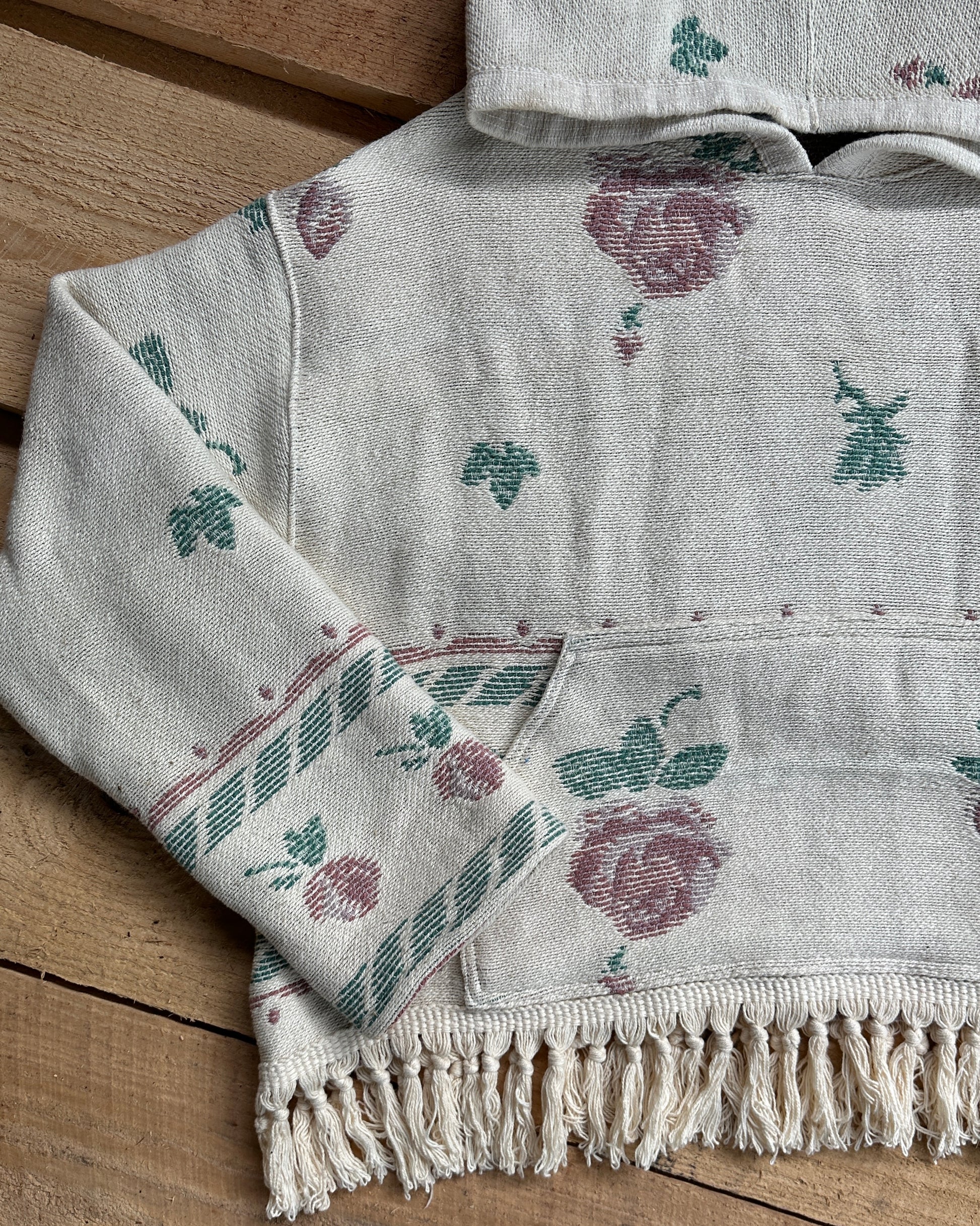 Medium weight woven hoodie, featuring fringe ties around the waist.