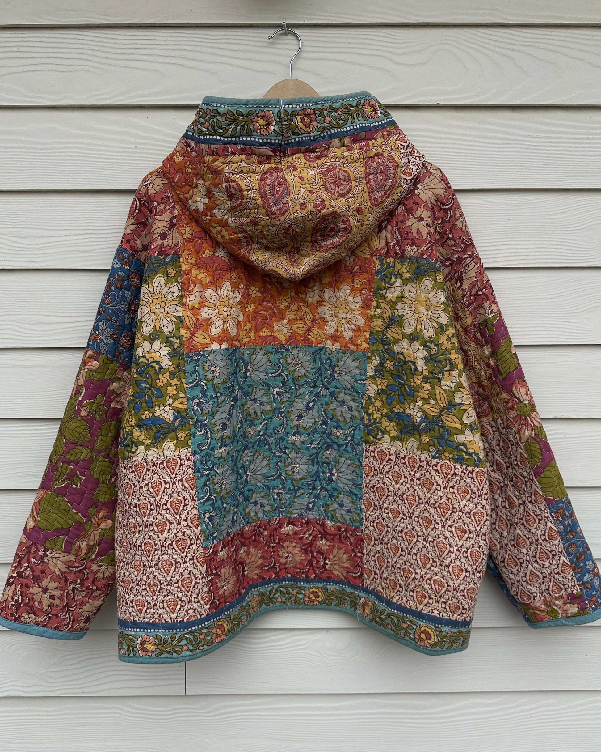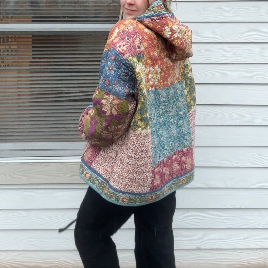 Size extra large hoodie, made from a secondhand quilt. Super colorful floral quilt; lightweight and soft.