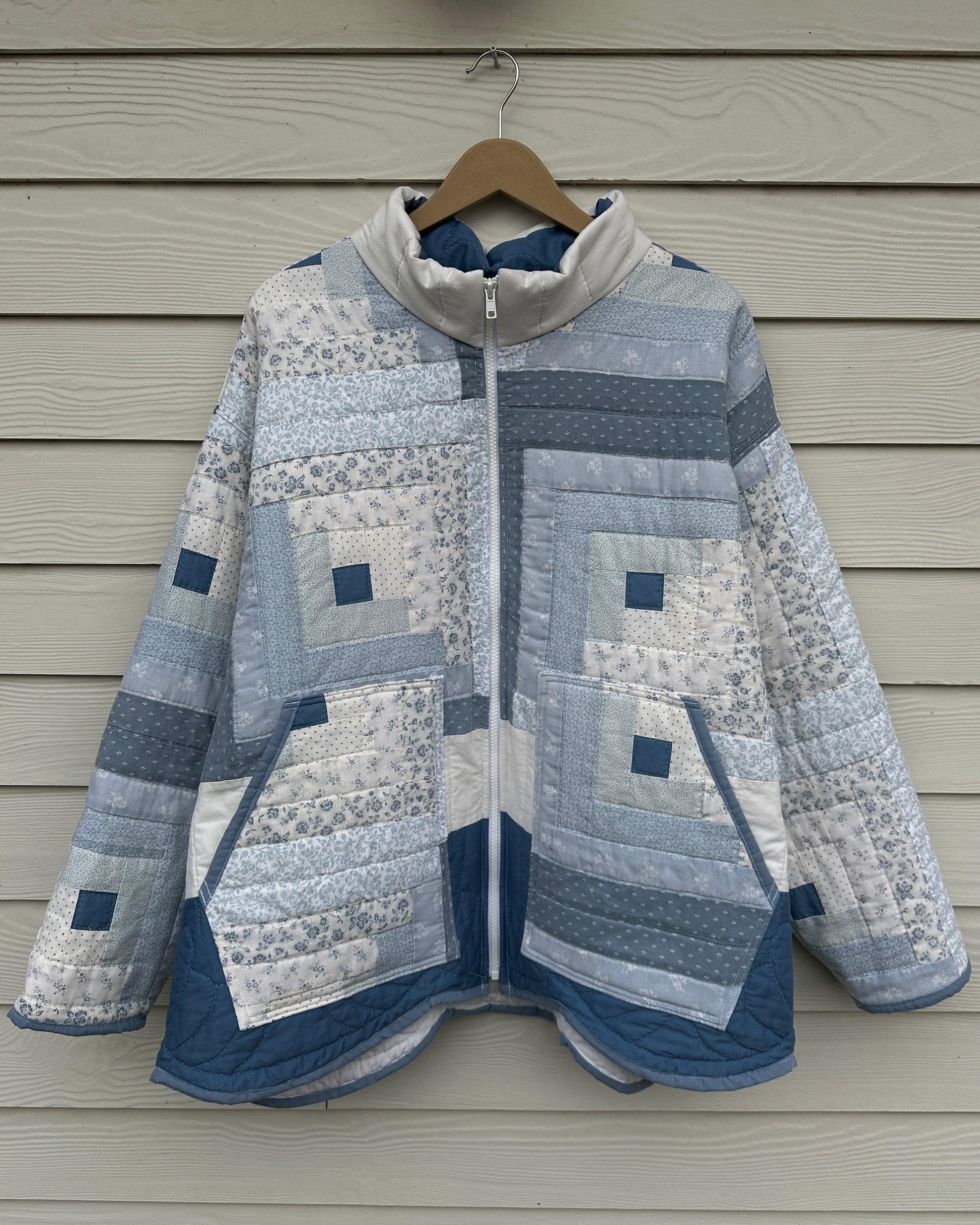 Size XXL jacket, made from a secondhand quilt. Jacket features a YKK zipper, large pockets, and a collar.